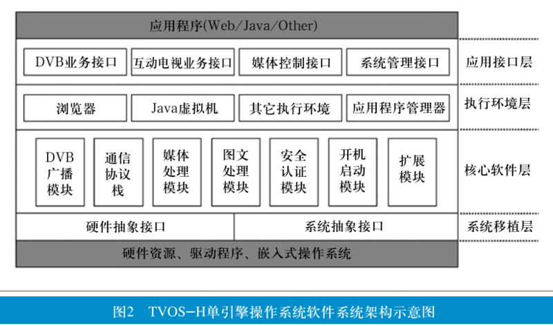 TVOS-H单引擎操作系统采用层状架构,从下到上可分为系统移植层、核心软件层、执行环境层和应用接口层,每层由一个或若干个模块构成[2],图2描述了TVOS-H单引擎操作系统的系统架构。