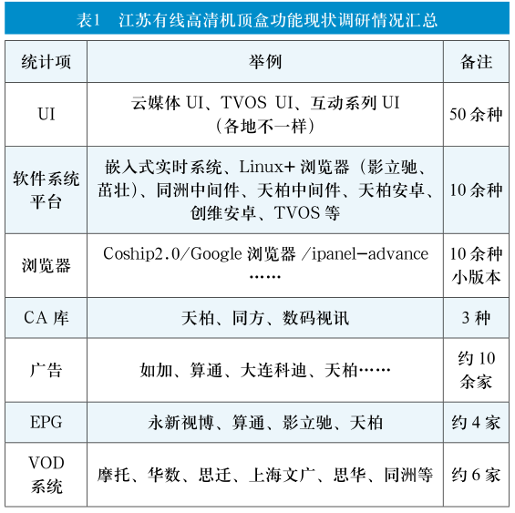 江苏有线经过多年的发展,目前拥有总计约2600万台在网机顶盒终端,根据2017年年底的数据统计,高清机顶盒约计500万余台(包括普通互动机顶盒和2011年至2013年上线的云媒体机顶盒[2])。由于历史原因,这部分存量机顶盒技术体系混乱,硬件品牌、型号、规格多种多样,软件方案纷繁复杂,给公司经营活动带来极大阻碍。具体调研情况如表1。
