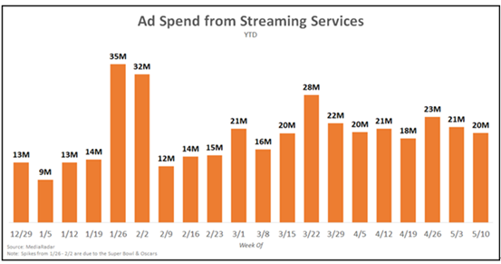 迪士尼公司在全球范围内增加了Disney+、 Hulu的广告支出,比较了3月15日之前的平均每周广告支出,不包括奥斯卡广告,这两家公司的广告支出增加了74%。从2020年3月15日到5月16日,亚马逊用于推广其流媒体服务的支出同比增长了29% 。