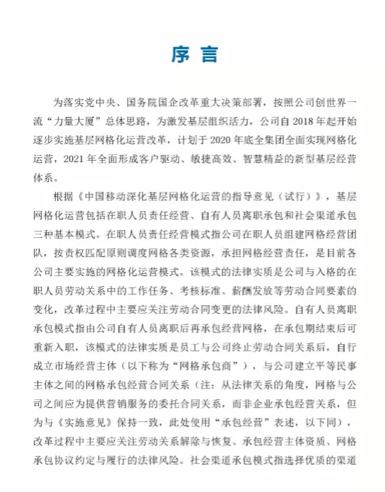 2020年5月,为进一步激发员工活力,中国移动内部正式发布了《基层网格化改革合规指南》和《基层网格运营合规指南》。
