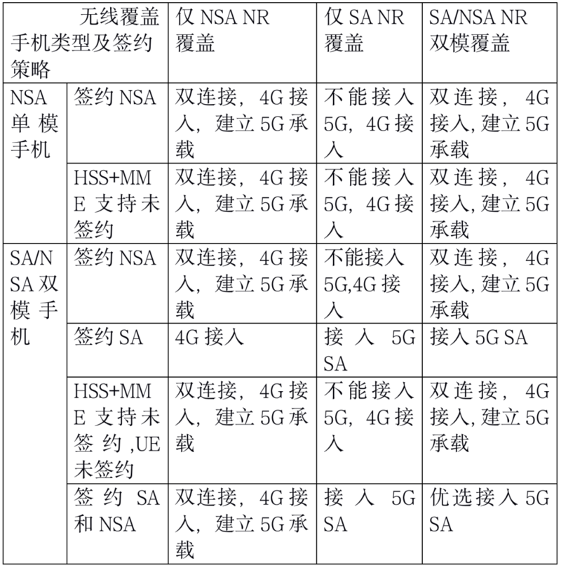 (2)仅有SA覆盖的小区,当用户签约SA后,NSA单模终端在SA覆盖区域开机将接入4G网络。SA/NSA双模终端已签约5G SA,并在SA覆盖区域开机,将从SA网络接入,并注册5G核心网。SA/NSA双模终端未签约5G SA,将接入4G网络。