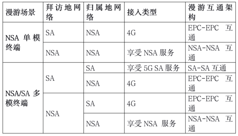 5G商用初期,大多数运营商均采用NSA技术架构部署5G网络。对于多模共存的运营商,国际漫游情况如表2所示。