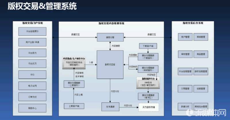 我们从运营商的需求出发,提供了端到端的版权生态服务,运营商引入版权内容开始就有对版权的管理需求,包括版权的交易,版权内容的管理,版权内容的审核和分账。