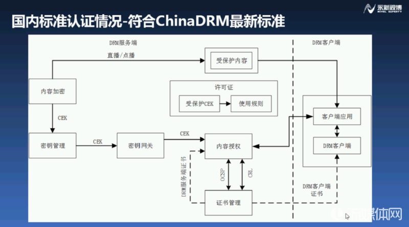 永新视博DRM产品是完全符合ChinaDRM新标准所提出的各项要求的。在国内标准方面,永新视博参与编写了ChinaDRM 277-2019标准;同时也通过了广科院的DRM集成研发服务认证和DRM运行维护服务认证,我公司有能力帮助运营商通过视音频内容运营服务认证。