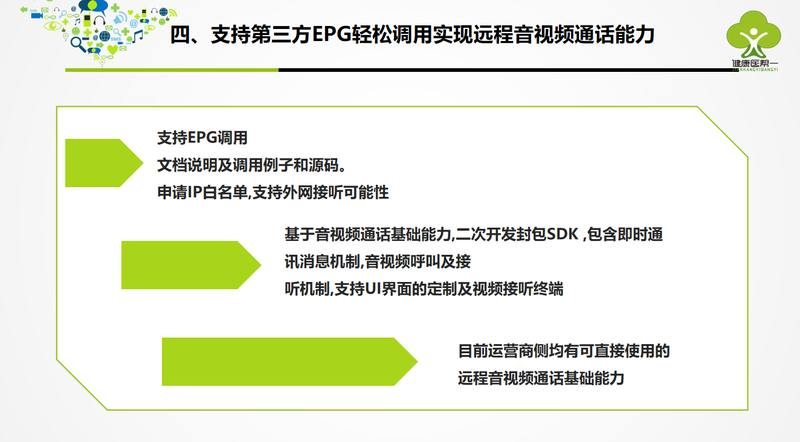 以技术为依托,在业务模式上我们主要通过IPTV这个直达家庭用户的特点,一方面在用户侧,通过大屏端展示关于营养、健康、医疗、养老等大健康相关的服务及产品,并支持实时音视频通话咨询;另一方面在服务机构侧,通过视频客服专用接听设备或手机,随时接听来自用户视频咨询呼叫。