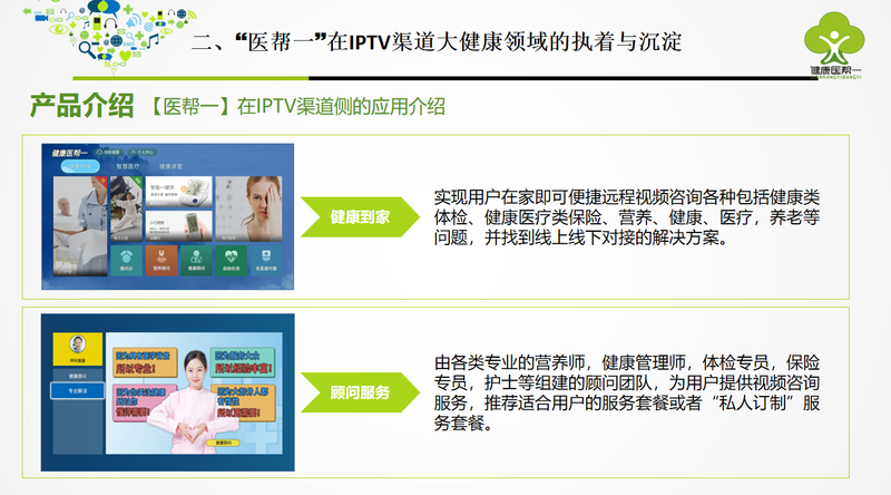 医帮一在IPTV渠道侧推出了多种业务服务。其中“健康到家”,可以实现用户在家即可便捷远程视频咨询各种包括健康类体检、健康医疗类保险、营养、健康、医疗、养老等问题,并找到线上线下对接的解决方案。