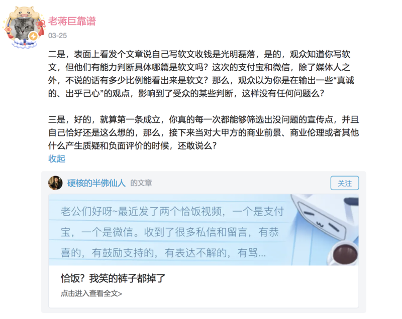 不同于美妆区的天生带货优势、或是生活区的场景式植入,知识区,尤其是观点输出类的UP主,视频内容很难恰饭。若与品牌方合作,如何保障自己内容的客观性成为难以平衡的问题。半佛仙人与老蒋巨靠谱就此问题进行过探讨。
