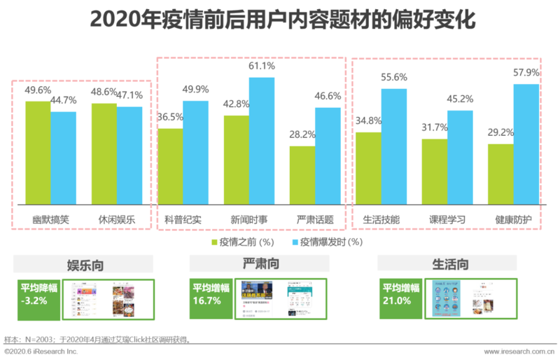 在艾瑞《2020年中国移动互联网内容生态洞察报告》中可以发现,内容去低质化成为主要趋势。在疫情爆发之后,用户对于严肃内容的偏好飞速上升。人们希望看到可信的、丰富的视频内容。