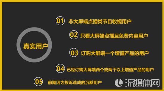 第一、非大屏端点播类节目收视用户:这部分用户几乎从来不在大屏端收看点播类节目,改变用户习惯虽然很难,但不是不可能,这部分用户我们要通过某种方式全力争取。