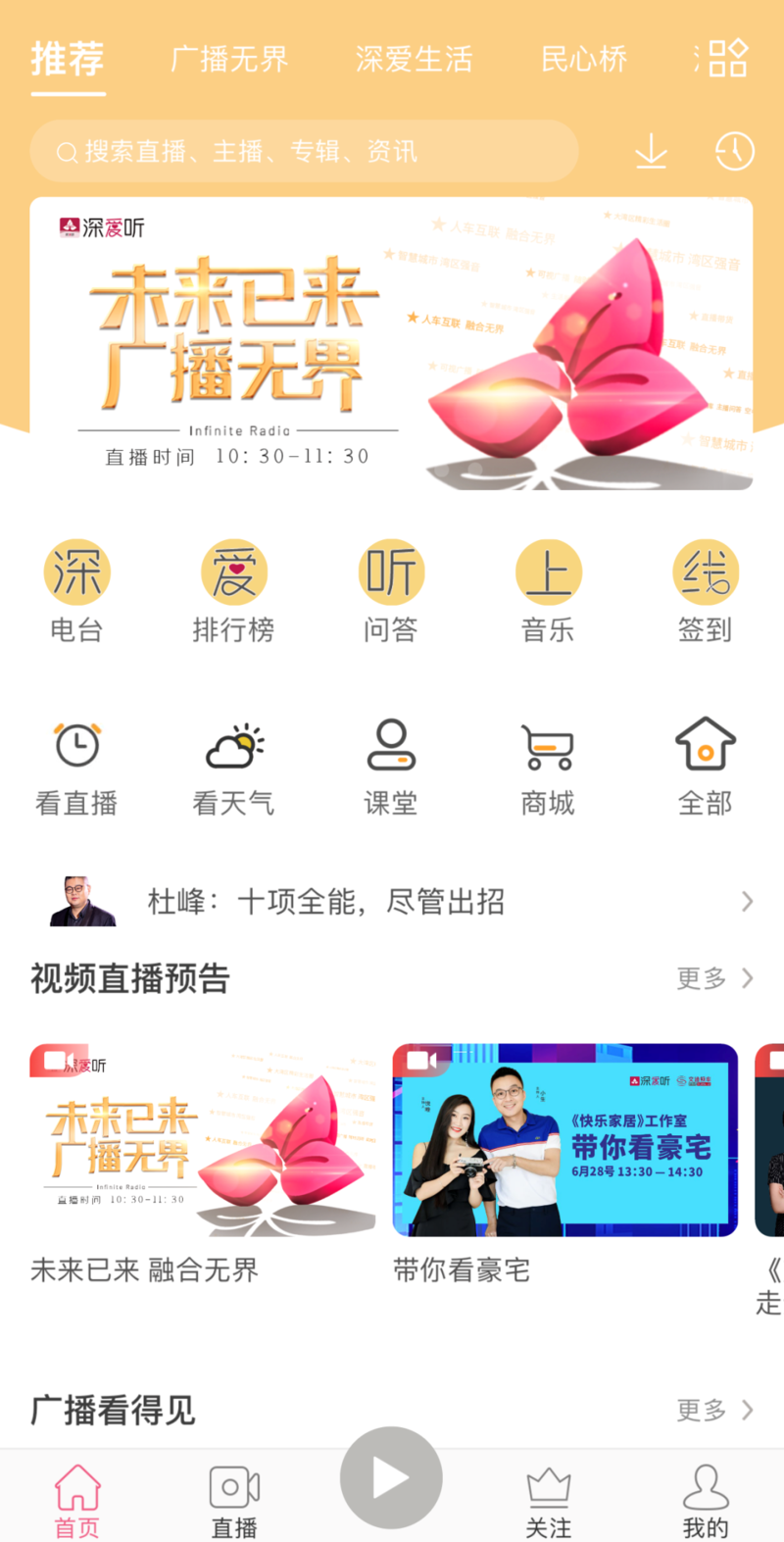 依托深圳广播的媒介优势和主持人资源,“深爱听”瞄准“智慧广播+融媒体创新实验室+深爱听APP+车联网”场景应用,力求通过在线收听、可视广播、随时回听、民生智库、实时互动、主播问答、空中课堂、直播带货、双向传播的融媒体广播形态,构建声音产业平台。