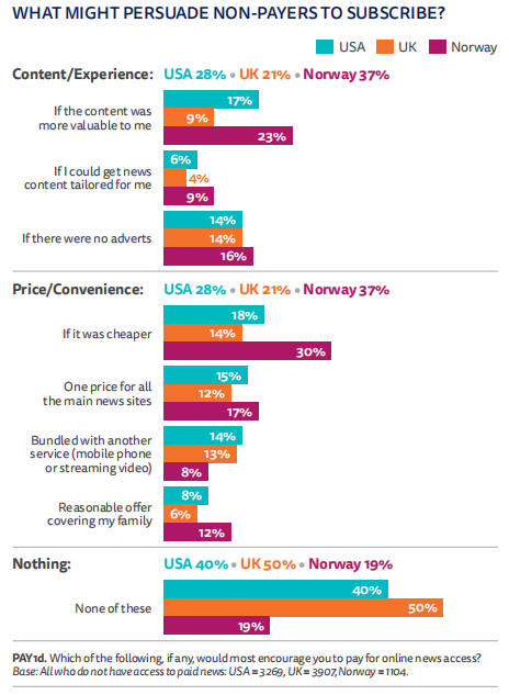 首先,免费新闻扼住付费墙的“喉咙”。40%的美国人和50%的英国人表示,“没有什么能说服他们为新闻付费。”大抵是因为,他们或对新闻内容不“感冒”,或免费新闻已经能满足自己的需求。而在免费新闻受到严格限制的挪威,仅有19%的访者称,不会为新闻付费。