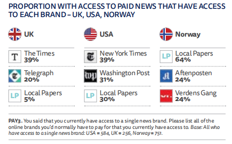 路透社研究人员又对上述三个国家进行二次调查后发现,少数头部的新闻媒体成为付费模式的赢家。在美国,接近一半的新闻付费用户订阅了《纽约时报》或《华盛顿邮报》;在英国,订阅《泰晤士报》或《电讯报》的比例和美国类似,但用户数量相对少得多;在挪威,《晚邮报》(Aftenposten)成为数字订阅的翘楚,占领国内新闻付费24%的市场份额,还有两家运营付费墙模式的小报——VG(24%)和Dagbladet(14%)。值得一提的是,挪威地方性报纸的订阅人数占比达到64%,并且其国内大多数地方新闻媒体都对在线新闻设置了付费墙;然而在美国,只有30%的用户订阅了本地新闻,英国的比例就更少了(5%)。