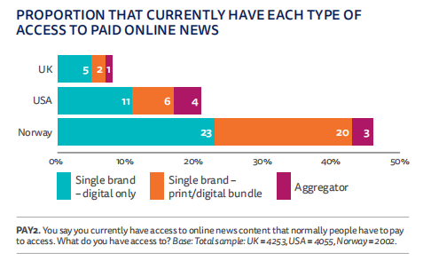 注:英国、美国、挪威目前三种数字新闻订阅方式的分布情况(来源:路透新闻研究所)
