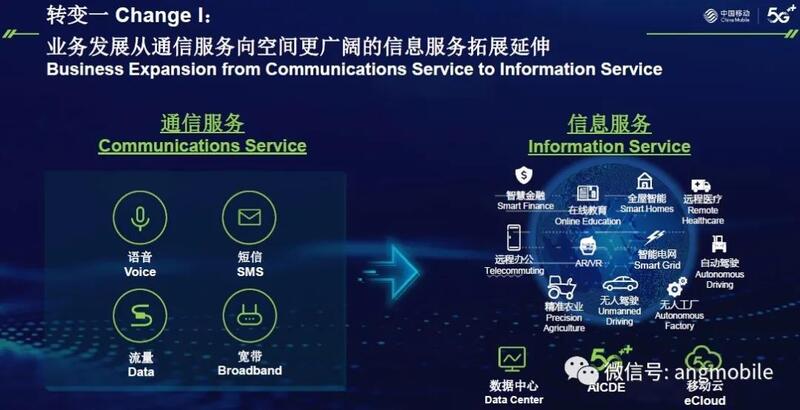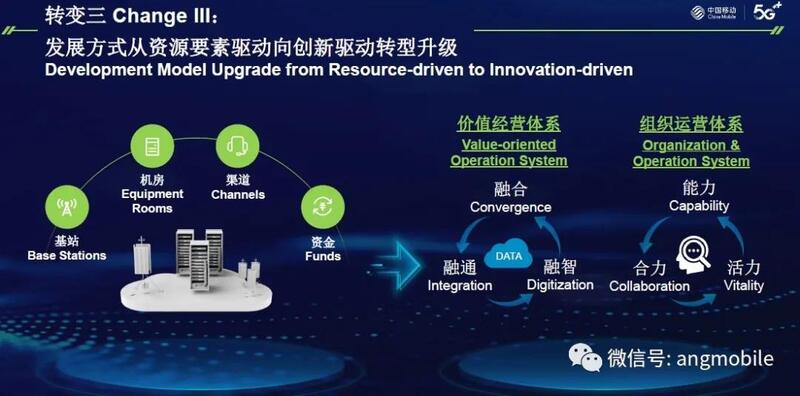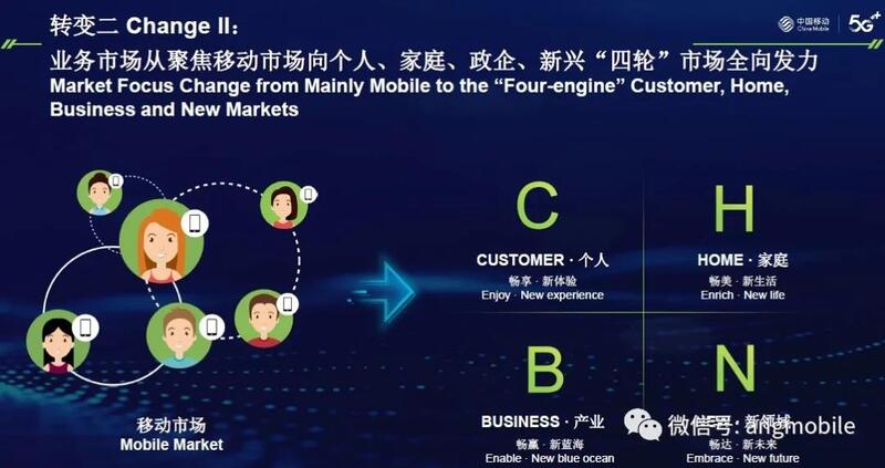 这一蓝图的总体方向可以进一步概括为“三个转变”。一是业务发展从通信服务向空间更广阔的信息服务拓展延伸。中国移动将把握新一代信息技术深度融入经济社会各个领域的契机,加快转变业务模式,以5G、云和数据中心为关键抓手,着力构建支撑数字经济发展的基础底座,实现从传统通信服务向空间更广阔、价值更高的信息服务延伸,拓展十万亿级信息服务蓝海空间。二是业务市场从聚焦移动市场向个人、家庭、政企、新兴“四轮”市场全向发力。顺应数字化应用向更广领域延展趋势,以个人、家庭、政企、新兴CHBN四轮市场的数字化产品和品牌构建为核心,加快转变业务范畴,优化收入结构,拓展企业新的增长点,不断满足经济社会转型需求和人们数字化美好生活需要。三是发展方式从资源要素驱动向创新驱动转型升级。面对需求多样的信息服务市场,创新驱动成为企业唯一选择,通过构建基于规模的“融合、融通、融智”价值经营体系,实现资源优势向竞争优势的高效转化,通过打造高效协同的“能力、合力、活力”型组织运营体系,推动组织、机制和战略的有效协同,实现生产力和生产关系的长期动态匹配。