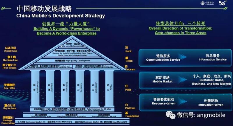对中国移动而言,2020年也是具有里程碑意义的一年,20年前的4月20日,中国移动正式成立。经过20年高速发展,中国移动已成为服务超10亿客户、员工数量近50万的电信运营商。面向新的历史方位,公司明确创世界一流“力量大厦”发展战略,以创世界一流企业,做网络强国、数字中国、智慧社会主力军为目标,以高质量发展为主线,围绕转型升级、改革创新两个着力点,打造基于规模的“融合、融通、融智”价值经营体系,构建高效协同的“能力、合力、活力”组织运营体系,全面实施“5G+”计划,做大连接规模、做强连接应用、做优连接服务,统筹推进CHBN“四轮驱动”融合发展,并按照建筑学中“顶、梁、柱、台、基、枋”的典型结构,将企业战略行动进行有机组合。