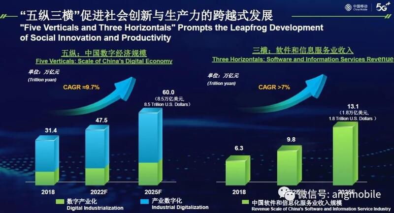 整体来看,“五纵三横”体现了信息技术正由局部相关领域向经济社会各领域广泛深入扩散,将进一步促进社会创新水平的整体跃升和生产力的跨越式发展,也将开启信息通信业发展的新阶段。预计到2025年,在“五纵”的推动下,中国数字经济规模将达到60万亿元;而“三横”将带来国内软件和信息服务业收入规模达到13万亿元。