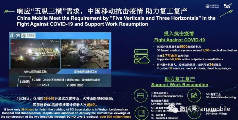 疫情爆发以来,中国移动积极应对,第一时间组织专业力量,全力以赴、多措并举投入到抗击疫情、助力复工复产的各项工作中。在抗击疫情方面,1月25日,中国移动仅用36小时率先在武汉开通了雷神山和火神山5G基站,实现对两处医院建设的5G高清直播,累计观看超5亿人次;5G远程医疗系统服务了全国超5500家医疗机构,支撑开展了4.7万余次远程会诊,并提供医疗服务机器人、疫情防控系统、云医院等34项服务;积极支撑“国家远程中心会诊平台”建设,承担新冠肺炎重症、危重症患者国家级远程会诊任务,为战疫一线保驾护航。在复工复产方面,中国移动充分发挥信息化优势,提供“云视讯”远程办公、城市超脑大数据、5G+超高清直播等服务,助力政府和企业高效运转;5G远程教育助力校园复教,实现学生“停课不停学”;5G智慧工业作业区域实现无人化、少人化,助力工业企业加快复产;5G智慧乡村助力疫情防控保平安,健康复工促生产。