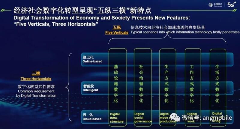 结合当前形势看,经济社会的数字化转型进程正在加速,并呈现出“五纵三横”的新特征。“五纵”是当前信息技术向经济社会加速渗透的五个典型场景。一是基础设施数字化,信息技术向基础设施建设运营全生命周期渗透赋能,使基础设施更加智能、高效。二是社会治理数字化,基于社会化大数据的应用创新和精细化管理决策贯穿于社会治理各环节,加速治理模式由人治向数治、智治转变。三是生产方式数字化,通过优化重组生产和运营全流程数据,推动产业由局部、刚性的自动化生产运营向全局、柔性的智能化生产运营转型升级。四是工作方式数字化,远程办公应用加速普及,线下集中的传统办公模式将向远程协同常态化的新办公模式不断演进。五是生活方式数字化,数字生活应用沿生活链条不断延展,从满足规模化、基础性的生活需求向满足个性化、高品质的生活体验升级。“三横”是当前经济社会数字化转型的三大共性需求。随着疫情下经济社会数字化进程加速,线上化、智能化、云化平台逐步成为全面支撑经济社会发展的产业级、社会级平台,并呈现出横向扩张延展的新特征。一是线上化,永续在线打破物理空间和网络空间的边界,拉动连接规模持续增长;二是智能化,全量数据挖掘重塑资源配置和生产运营逻辑,成为关键生产要素;三是云化,云基础设施由“中心”向“中心+边缘”结合的立体布局转变,成为产品服务交付的基本载体。