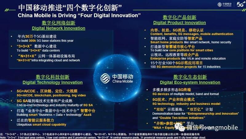 结合在抗击疫情中的实际运用成效来看,信息技术在助力经济社会转型升级中的关键作用已日益凸显。中国移动将面向全球客户推进“四个数字化创新”,持续深化落实创世界一流“力量大厦”,努力为疫情后的经济社会发展贡献力量。一是数字化网络创新。顺应“三横”趋势,大力推进5G网络建设,力争提前完成年内30万个5G基站建设目标,确保地级以上城市城区全面良好覆盖;加快“3+3+X”数据中心建设,年内实现全国数据中心投产能力超百万架,高效支撑各行各业智能化应用算力需要;加快形成“N+31+X”云网一体基础设施布局,推进网络云化、业务云化、能力云化,为数字经济发展提供网络基础。二是数字化产品创新。把握“五纵”机遇,加大产品创新力度,加快内容、权益、5G消息、移动认证等产品建设,推动智能组网、家庭安防等智家产品布局,打造新型智慧城市核心平台,大力发展云视讯、远程教育等数字化产品,加快15个行业100个5G示范应用项目落地推广,不断创造更智能、更便捷、更丰富的数字化服务体验,全面支撑产业转型升级。三是数字化科技创新。充分发挥科技创新引领作用,积极布局5G+AICDE、区块链、定位、大视频等融合创新能力体系构建,加快推动5G SA端到端技术完善和产业成熟,加强网络智能化技术攻关,构建“业务中台+数据中台+技术中台”的智慧中台体系,提供泛在的智能云服务能力,夯实网、云、边、智融合的技术基础,为社会和企业自身持续发展提供强劲动力。四是数字化生态创新。大力推进5G共建共享,推动多模多频多形态5G终端发展成熟,联合垂直行业合作伙伴,加快推动5G技术、产业和商业模式迭代成熟,持续推进“双创”示范基地建设和“双百亿”生态引入与合作分享计划落地,构建“并购+参股+创投”投资平台,打造资源共享、融通发展的创新生态。