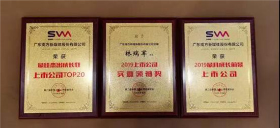 1月9日,第二届中国上市公司发展年会在北京举行,新媒股份成功入围“2019 中国上市公司科创发展百强”名单,并荣获“最佳杰出成长性上市公司 TOP20”、“2019最具成长前景上市公司 、“2019上市公司实业领袖奖”三大奖项。