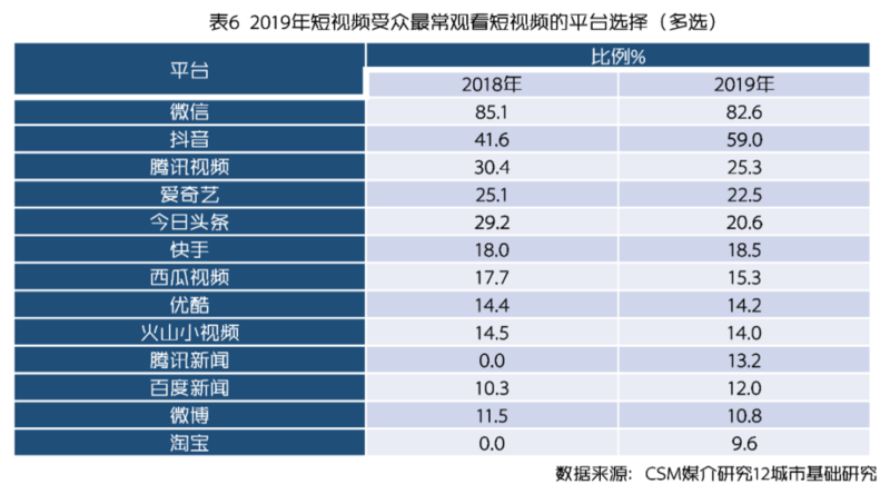 短视频内容生产者数量众多,平台的流量分布呈现出极端分化的格局,并向头部账号高度集中。根据CSM媒介研究2019年基础研究调查数据,微信、抖音、腾讯视频、爱奇艺和今日头条是短视频受众选择最多的平台,微信以82.6%的比例遥遥领先(表6),成为最受欢迎的短视频收看平台,这和微信已经成为日常生活中不可或缺的沟通方式不无关系。