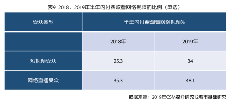 《2018中国网络视听发展研究报告》指出,视频网站的付费业务自2010年逐渐推出,2015年后网络自制内容快速发展,在2016年增速达108.8%,此后用户付费比例逐年上升,截至2018年第三季度,网络视频用户的付费比例达53.1%。网络视听内容已经成为网络用户的精神文化的刚需消费,内容付费渐成趋势。2019中国网络视频精品研究报告指出,2018年网络视频付费用户规模达到3.47亿人,用户付费意愿逐渐提升,内容付费在视频网站总收入的占比也越来越大。同时,CSM2019年12城市基础研究数据显示,34%的短视频用户在半年内付费观看过网络视频,比2018年上升8.7%,网络直播受众付费观看比例更高,为48.1%,上升幅度更大(表9)。