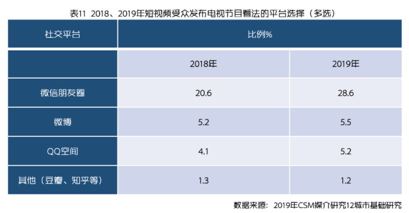 微博、微信、QQ空间是当前中国最常见的三种具有社交功能的应用,从社交关系的强弱来看,微信的联系人更倾向于强关系,社交圈子有现实生活中的朋友、亲人、老师、同学、同事等,这些圈子个人关系较为紧密。微博和QQ空间的圈子则以陌生人、网友居多,更多地是在网上接触并未在现实生活中接触的朋友,属于弱关系。这也是微信朋友圈在近几年迅速火热起来的一个因素,它是人们互动最为紧密的一个所在。短视频受众在微信朋友圈转发、评论曾经收看过的电视节目的比例为28.6%,是其在微博发布电视节目看法比例的5倍有余(表10-11)。