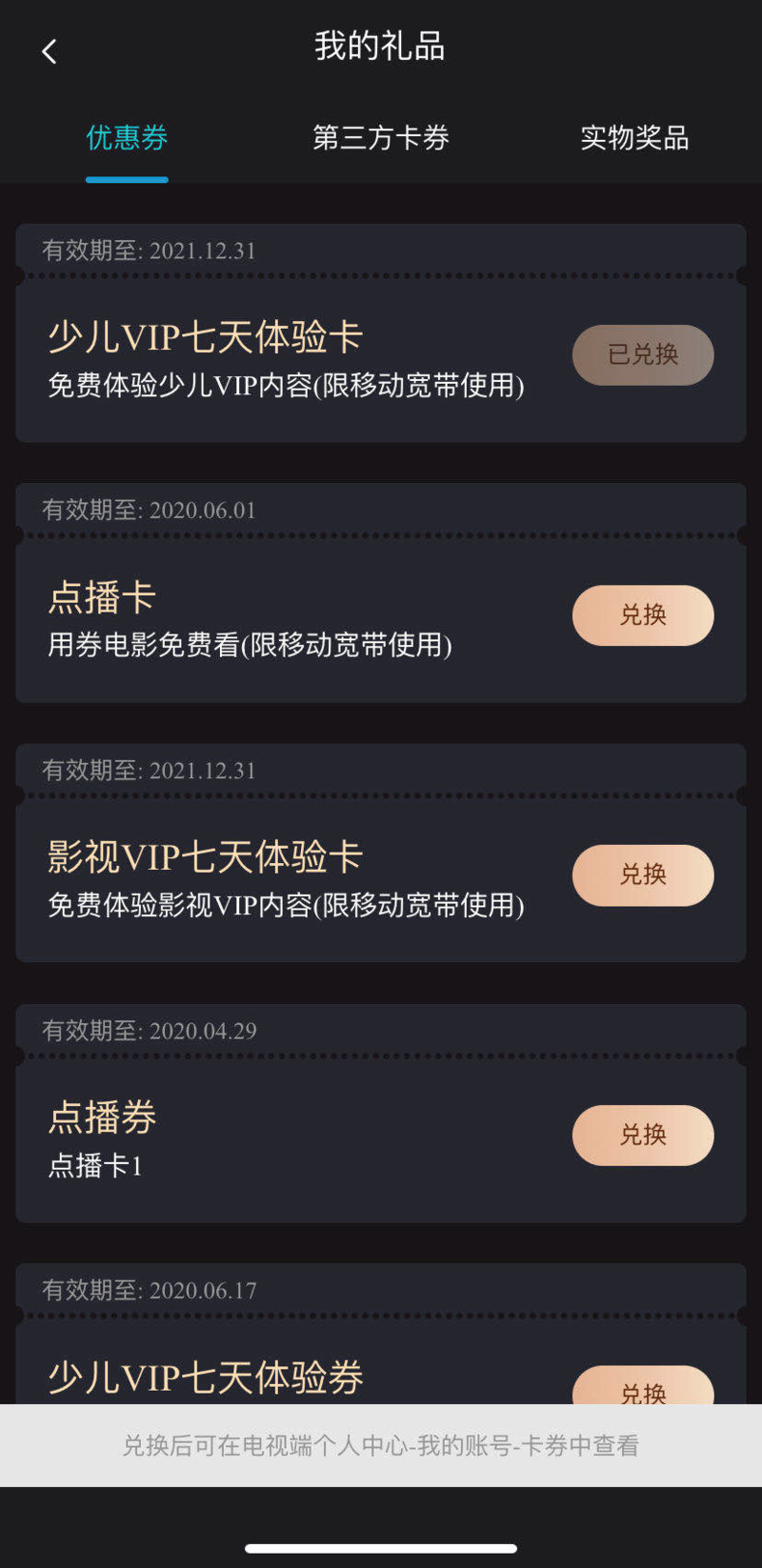 激活会员,即可领取免费体验券、点播券让你看片不受限,刷剧刷不停点击“我的会员卡”进入专属会员权益页面领取礼品