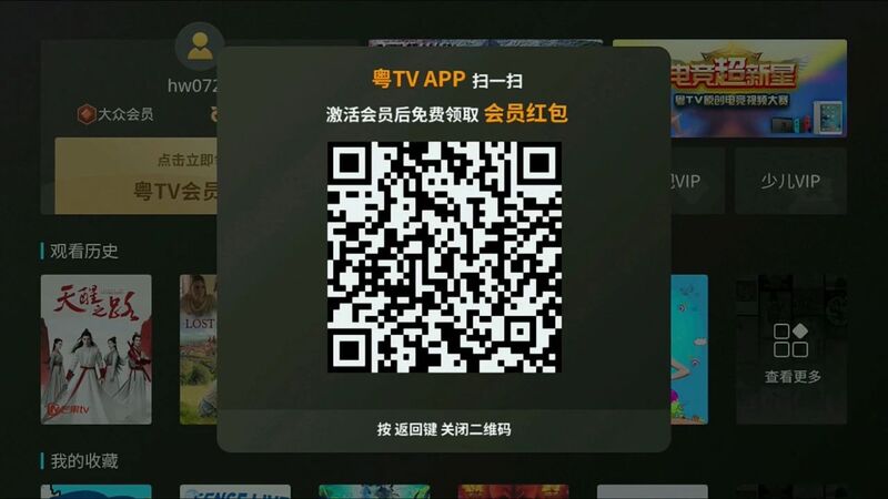 打开电视端个人中心-我的账号-立即领取粤TV会员红包中的二维码再次扫码