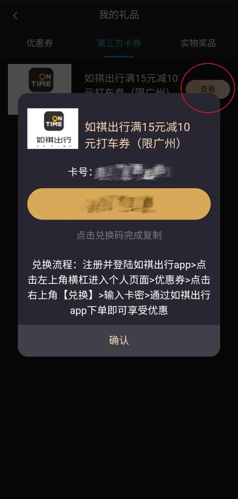 第五步点击“查看”,可查看卡密根据兑换流程使用即可