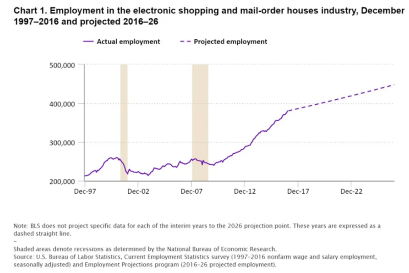 有意思的是,电商的增长也改变了零售业的劳动力流向。据美国劳工统计局(BLS)透露,1997年到2016年,美国电商领域的就业人数增长了80%,BLS还提出预测,电商行业劳动者数量还将持续增长,到2026年,美国相关行业就业人数将达到45万人。(来源:BLS,《电商中的就业增长和工资变化》,作者:Elka Torpey)