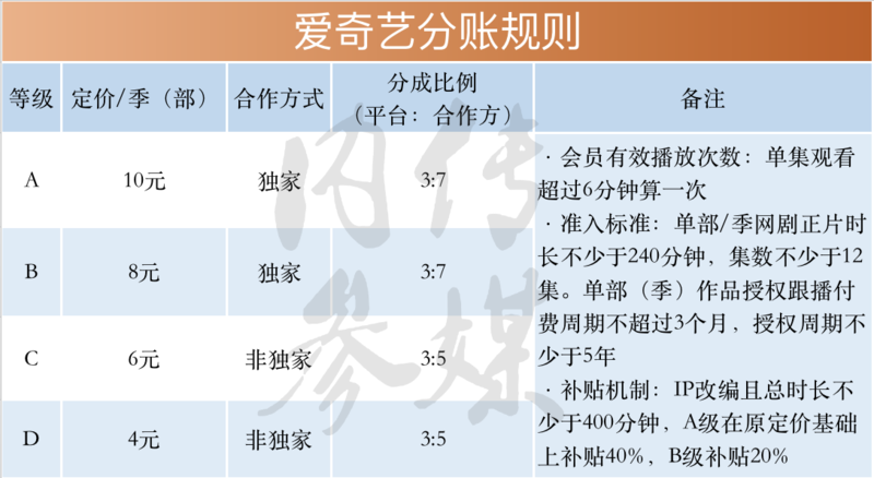 那么在会员付费、广告的常规分账模式上,爱奇艺也会为优质作品进行一定“奖励”和“补贴”,不仅分成定价较高,还会根据IP改编的知名度或内容等级进行20%-40%的补贴。