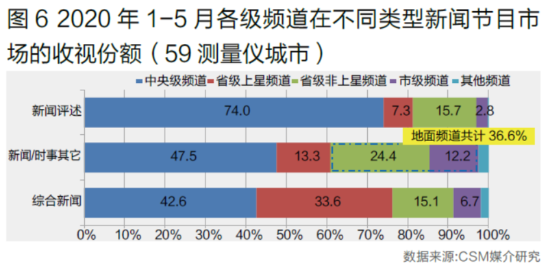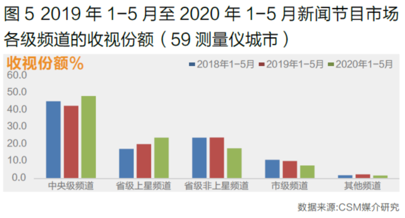 中央级频道收视份额居首,地面频道播出量占优今年1-5月新闻节目收视市场中,中央级频道仍然占据着最重要的位置,以5.4%的播出量为新闻节目贡献了最高的收视份额(48.5%),较2019年同期增加了近6个百分点;省级上星频道播出量为10.4%,加之各地省一级重要新闻均在此平台播出,收视份额也相对较高(24.1%),较上年增长了3.8个百分点;省级非上星频道和市级频道的传播范围类似,面对的观众群体在地域上相对比较集中,尽管单个频道覆盖面不广,但胜在频道众多,因此播出量也最大,占所有新闻节目播出时间的近80%,这两类频道累计共获得了新闻节目25.6%的收视份额,较上年同期份额均有所下滑(图5)。