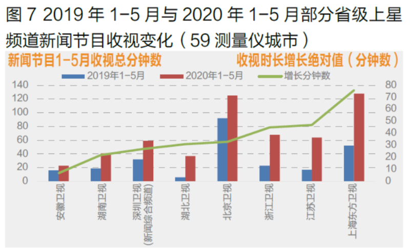 部分省级卫视新闻节目收视增长明显2020年1-5月部分省级上星频道新闻节目收视量增长明显,其中湖北卫视增幅最为迅猛,增幅高达516.7%。身处抗疫阵地最前沿的湖北广电,今年疫情发生后率先打破常规编排。湖北卫视成为全国最早开始多时段、大时段直播疫情防控的主流媒体。湖北卫视全天开设6档新闻直播和1档演播室访谈,1-2月全天播出的新闻节目近410分钟,1月31日在59测量仪城市的市场份额达到最高(0.84%),较春节前翻番。