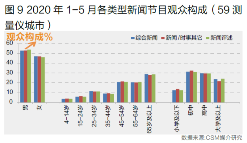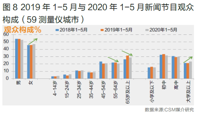 年轻、高学历受众回归大屏全国电视观众中女性观众略多于男性,而新闻节目的观众中则为男性多于女性。2020年1-5月收看新闻节目的男、女观众数量之间的差距进一步缩小,女性对新闻节目的关注较前两年同时期有明显地提升;从观众年龄与学历的构成来看,超过七成的新闻节目观众年龄在45岁以上,初高中学历观众占主体。二者在今年上半年也呈现出了新的特征:55岁及以上中老人群比例出现下降,54岁及以下年轻受众扭转了近两年持续下跌的势头,特别是15-34岁青少年受众比例显著提升;另外,大学及以上高知观众也逆势增长,回归电视新闻节目(图8)。