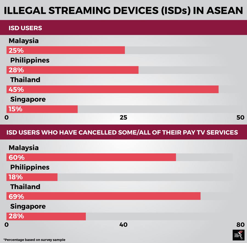 盗版是东南亚的区域性问题。按照2018年底的报道,同样由YouGov进行的调查发现,多达45%的泰国消费者使用非法流设备ISD播放盗版电视和视频内容,其次是菲律宾(28%)、马来西亚(25%)和新加坡(15%)。其中在泰国,芒果TV、HD Playbox和U Play是最受消费者欢迎的盗版应用;并且,近四分之一的泰国受访者声称,由于拥有非法流媒体设备,他们取消了对泰国在线视频服务的订阅。