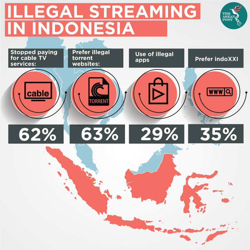 盗版问题严峻。根据2019年12月20日的报道,由亚洲视频产业协会(AVIA)的反盗版联盟(CAP)委托,由YouGov进行的一项关于印度尼西亚消费者在线内容观看行为的新研究显示,印度尼西亚近三分之二(63%)的在线消费者已经访问了流媒体盗版网站或BT网站来访问付费内容但却没有支付任何订阅费。该调查还发现,有29%的消费者使用互联网机顶盒来播放盗版电视和视频内容。这些电视盒,也称为非法流设备(ISD,illicit Streaming Devices),预装了非法应用程序,使用户能够以通常较低的年度订阅费访问数百个盗版电视频道和视频点播内容。截至调查期间,非法应用程序indoXXI(Lite)是最受欢迎的应用程序,并印尼有35%的ISD用户使用了该应用程序。在18岁至24岁之间的年轻人中,有44%的人承认使用此非法服务,因此该应用程序在年轻人群中更为流行。在承认访问流媒体盗版网站或torrent站点的63%的消费者中,有62%表示他们已取消了对合法付费电视服务的全部或部分订阅——这一数字非常惊人。