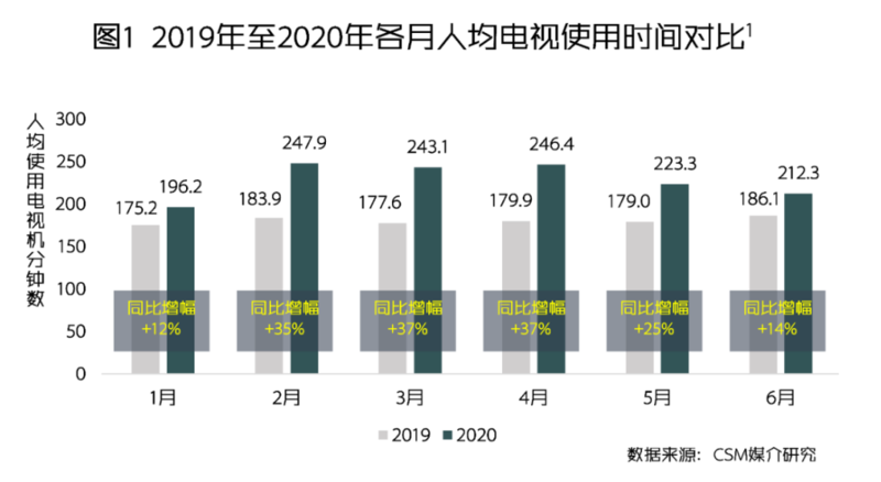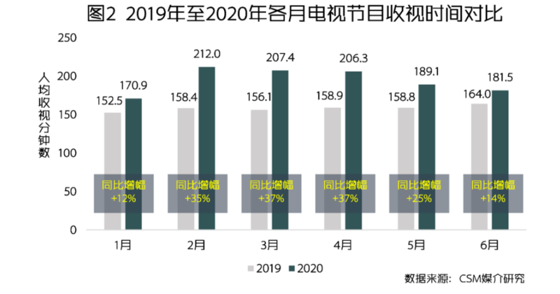 收视调查数据显示,疫情期间,电视使用量的增加,主要是电视节目收看时间的增长所致。2020年1月下旬以来,香港观众收看电视节目的时间较2019同期有所增长。2-4月期间,香港观众每天收看电视节目的时间较上年同期多50分钟,同比增幅超过30%。