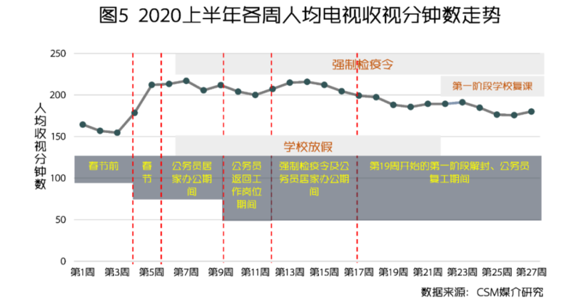 1月下旬春节之后,电视收视量高位盘整直至6月份,第15周之后,总体电视收视量出现了下降(图5)。