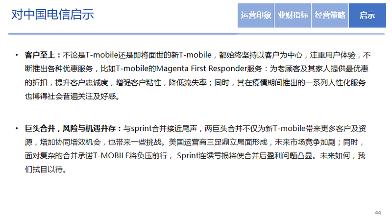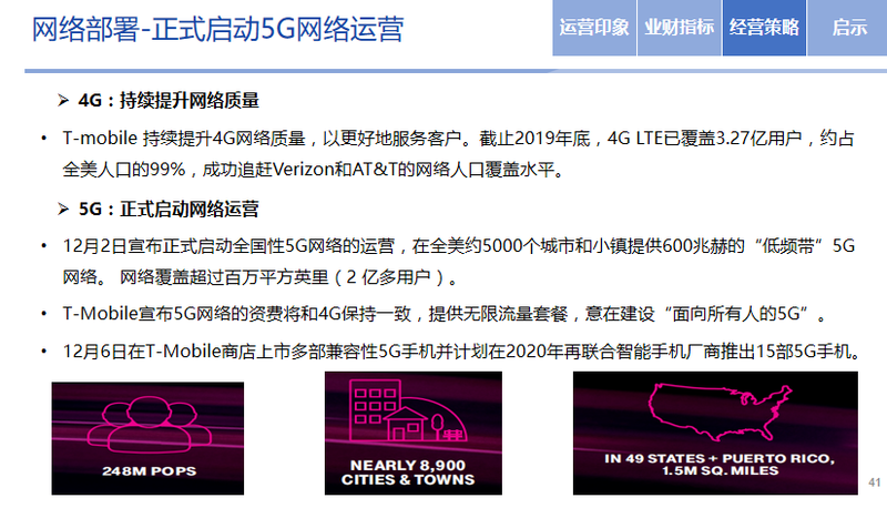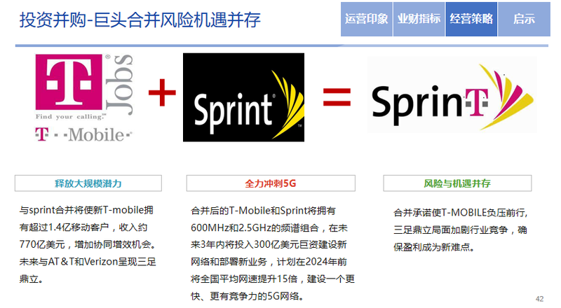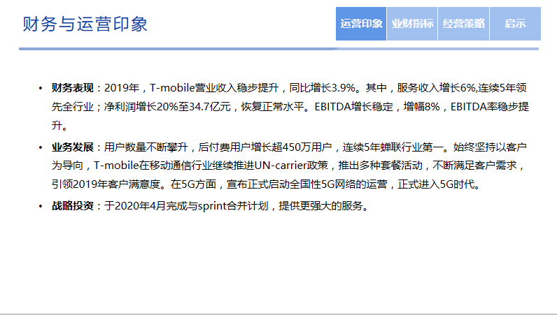 持续推进与Sprint合并,T-mobile于2020年4月完成与sprint合并计划,提供更强大的服务。