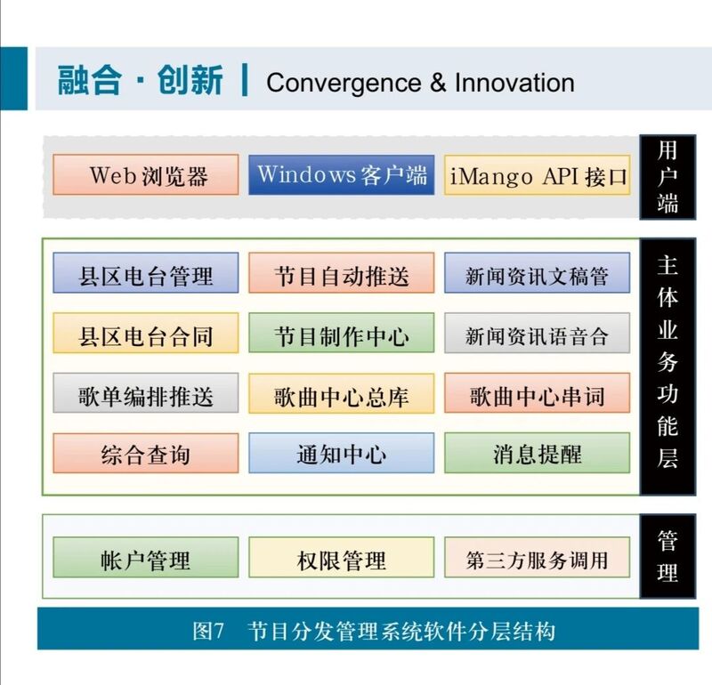 新型 5G 智慧广播 iMango 节目分发管理系统是为县区电台打造的一个专项系统平台,整个系统采用 Java 语言设计,从功能上分三层结构,清晰地分离不同业务范围,有利于日常管理和系统扩容,如图 7 所示。