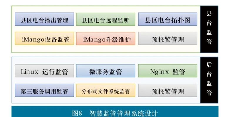 包括远端县区电台播出站的日常监管、核心业务本地和云端 Linux 和 Windows 服务器运行监管、微服务监管、Web 反向代理服务器监管、第三方服务资源调用情况监管、分布式文件系统监管等。这些监管信息汇集到新型 5G 智慧广播技术总控,可实现故障发生时的及时响应,确保系统的稳定运行。