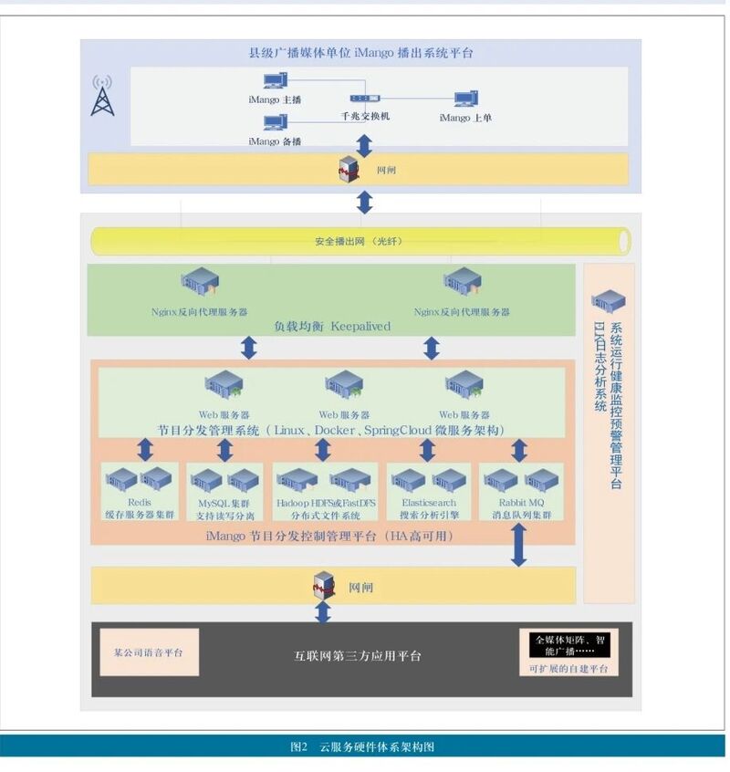 2)节目智能分发管理系统。此层次为 Web业务系统,部署的系统采用 Java[8] 语言开发,以 SpringCloud[8] 微服务架构建设,初期可采用 3台高性能物理服务器,通过 Docker[8] 容器来运行整个微服务架构系统,同时建立成 HA高可用的 Web 业务系统,随着用户量的增长带来的高并发,后续再增加扩展服务器支撑。