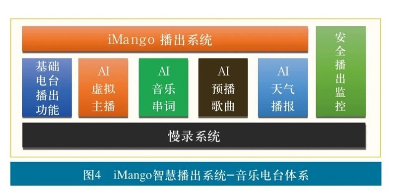 在所有设计的体系中,音乐电台体系是目前最受欢迎的体系,如图 4 所示。系统结合 AI 技术,以智能化播出为设计理念, 糅合传统电台音频时序播出功能,加入 AI 音乐串词、AI 天气预报、安全播出监控等功能,形成基础的音乐电台体系服务。