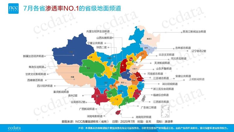从7月各省渗透率NO.1的省级地面频道来看,以新闻、都市民生类频道排名第一居多,此类频道以富有地方特色的社会新闻节目,贴近民生生活,满足大众需求;而在7月各省收视份额NO.1的省级地面频道中,影视、都市生活类频道成为当地收视份额第一的频道占据多数地位,主要是与影视节目播出时长以及此类节目本身的受欢迎程度有关。