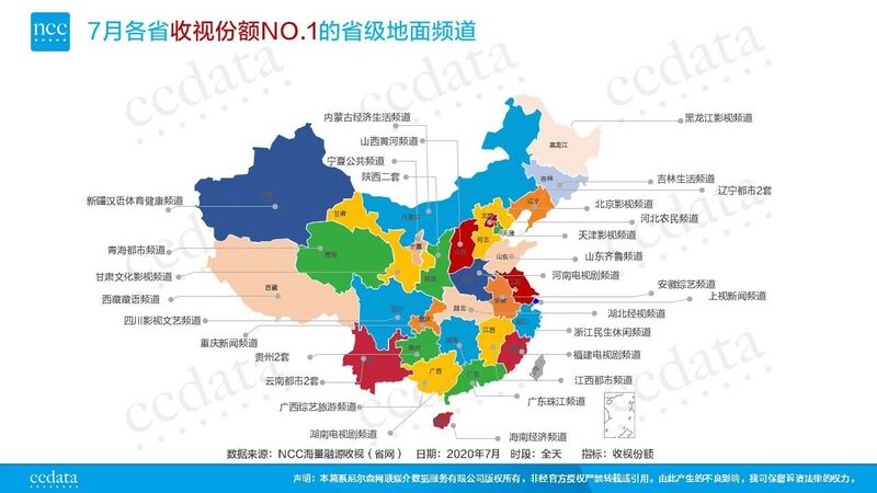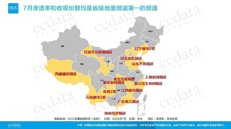 对比上面两张图可以发现,部分省级地面频道在收视“广度”和收视“深度”上都非常强势,所以不仅在渗透率上是NO.1,收视份额也同样排名第一。7月,全国31省直辖市中有14个频道是实力加冕的双料冠军。