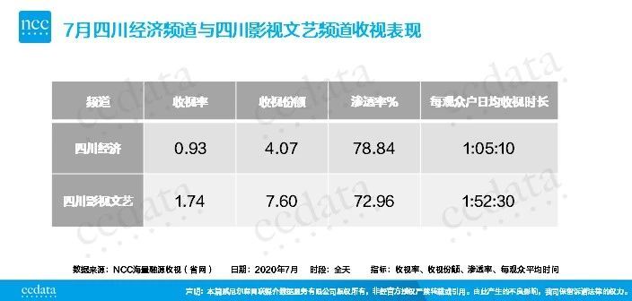 在其它省份,在收视份额与渗透率这两个指标下排名第一的频道各有所属。同省份内,不同定位的频道呈现错位发展、各具特色的现状。下面将以四川省为例,进一步解读这个现象。7月四川省级地面频道中,四川经济频道位居渗透率排名首位,触达家庭户数最多,省内影响广泛;而四川影视文艺频道在渗透率上与前者相差不大,但收视份额拉开明显差距,高居榜首,受频道主要播出的节目类型和内容影响,收看该频道的家庭户,停留时长更长,提升了频道的整体竞争力。在收视户数一定的情况下,收视时长会直接影响到收视份额的高低,而不会影响到渗透率。
