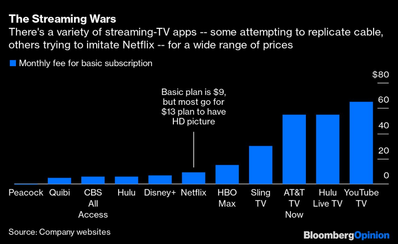 注:流媒体的订阅价格之战,Peacock以免费订阅0美元获得最低排名(来源:彭博社)