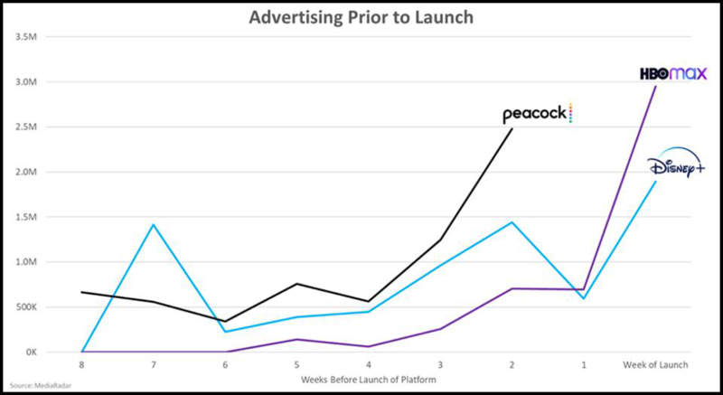 注:流媒体平台发布前的广告宣传支出费用比较情况,Peacock的花费要远远高于HBO Max和Disney+(来源:MEDIARADAR)