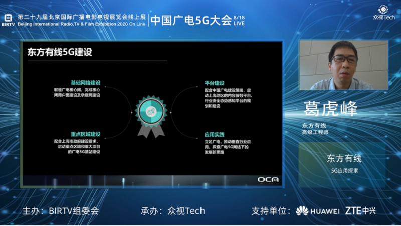 8月18日,由BIRTV主办,众视Tech与DVBCN联合承办的BIRTV2020——中国广电5G大会正式拉开帷幕,东方有线高级工程师葛虎峰在线上展会期间以《东方有线5G应用探索》为题,介绍了东方有线与中国广电5G协同方面的一些情况。